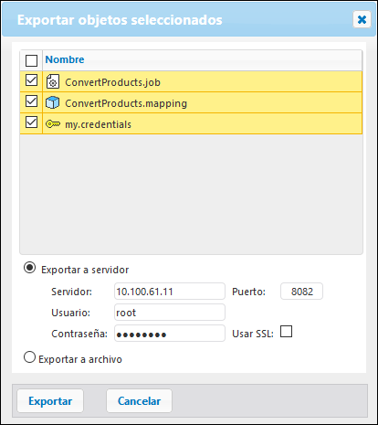 3.En el cuadro de diálogo Exportar objetos seleccionados que aparece (imagen siguiente), puede elegir si desea exportar sus datos de configuración a una instancia de FlowForce Server en ejecución (mediante la opción Exportar a servidor) o a un archivo con una extensión .zip. Si cambia a la opción Exportar a servidor, tendrá que introducir el nombre de host del servidor FlowForce Server de destino, el puerto en el que se está ejecutando y el nombre de usuario y la contraseña de la instancia de FlowForce Server de destino. Después, haga clic en el botón Exportar.
