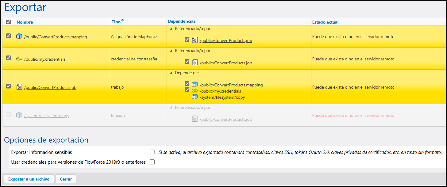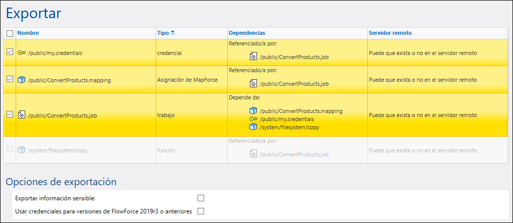 Los registros que aparecen con fondo amarillo son los que se van a exportar. Los registros que aparecen en gris representan dependencias de funciones de sistema integradas, por lo que no podrá realizar ninguna acción sobre ellos.