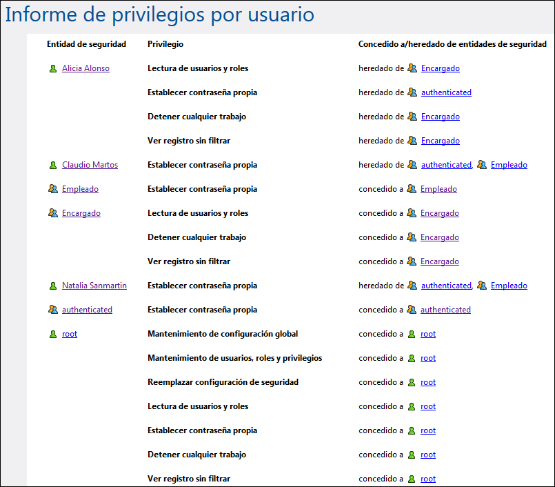 Como administrador de FlowForce Server a veces puede ser difícil estar al día sobre los privilegios concedidos, sobre todo a medida que aumenta el número de usuarios y roles. FlowForce Server ofrece una función para generar informes donde se resumen todos los privilegios concedidos a todos los usuarios y roles:
