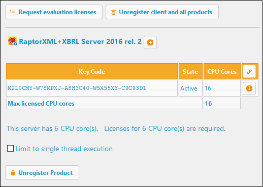 •En la parte inferior de cada entrada de producto hay un botón Unregister Product. Haga clic en él para quitar la licencia de un producto de LicenseServer. Si se asignó una licencia al producto, al quitarlo del registro esa licencia dejará de corresponderle.