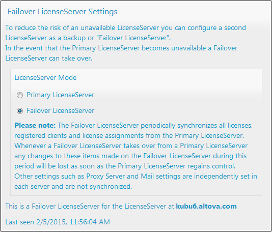 Cuando el servidor de conmutación por error esté configurado, tanto el servidor LicenseServer principal como el de conmutación por error incluirán información en la parte superior de la página indicando cuál es el estado actual del servidor. Por ejemplo, en las imágenes que aparecen a continuación puede ver un servidor de conmutación por error (Failover LicenseServer) y después el servidor principal (Primary LicenseServer).