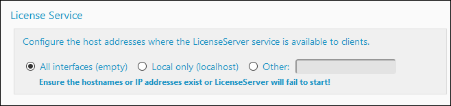 El equipo en el que está instalado LicenseServer se puede conectar a varias redes por medio de varias interfaces de red. En cada una de estas redes, el equipo de LicenseServer se conoce por su nombre de host y dirección IP. En este grupo de opciones puede configurar en qué redes estará disponible el servicio de licencias.