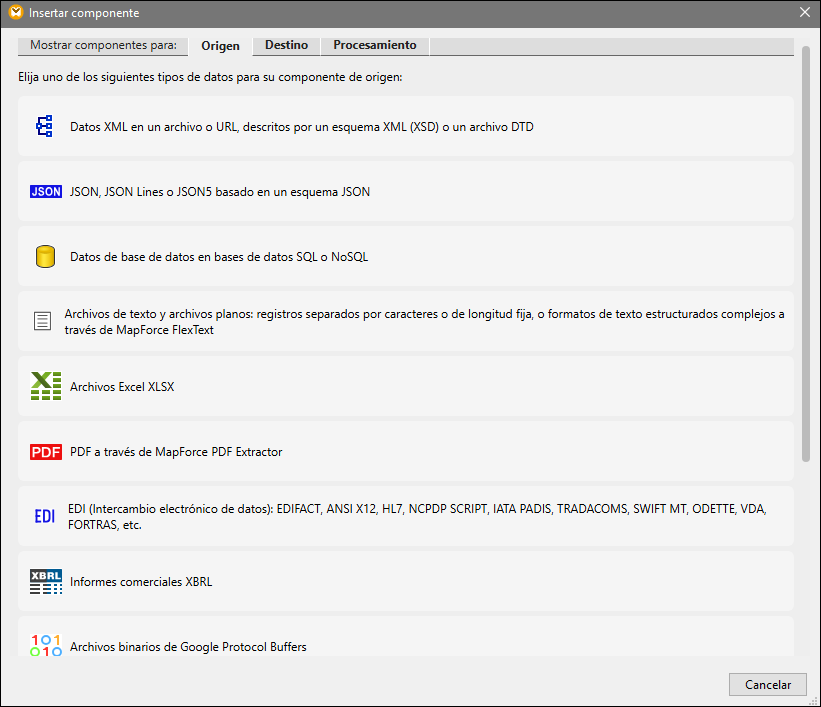 Cada tipo de componente tiene un objetivo y comportamiento concretos Para obtener más información sobre los componentes, consulte Componentes. Si quiere saber más acerca de las estructuras de datos que se pueden usar como componentes de origen y destino, consulte Componentes de datos. Puede añadir un archivo local, un componente desde una URL o desde la lista de recursos globales (consulte los apartados que siguen). Para más información sobre los componentes de MapForce que se usan para almacenar datos temporalmente o transformarlos, consulte Componentes de procesamiento.