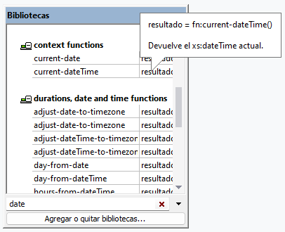 Para obtener la fecha y hora actuales puede usar la función current-dateTime. Para encontrarla empiece a teclearla en la caja de texto que hay en la parte inferior de la ventana Bibliotecas (imagen siguiente). También puede hacer doble clic en un área vacía dentro del panel Asignación y empezar a teclear current-date.