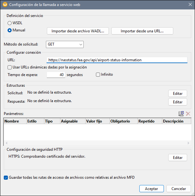 Este ejemplo sirve para explicar cómo se llama a un servicio web HTTP genérico desde MapForce. La descripción del servicio web al que se llama en este ejemplo puede encontrarse en https://app.swaggerhub.com/apis/FAA/ASWS/1.1.0. Este servicio web devuelve el estado actual de cualquier aeropuerto de EE UU (p. ej., cierres de aeropuertos, retrasos, etc.). El ejemplo viene acompañado de un diseño de asignación de datos que está en esta carpeta: MapForceExamples\AirportStatus.mfd.