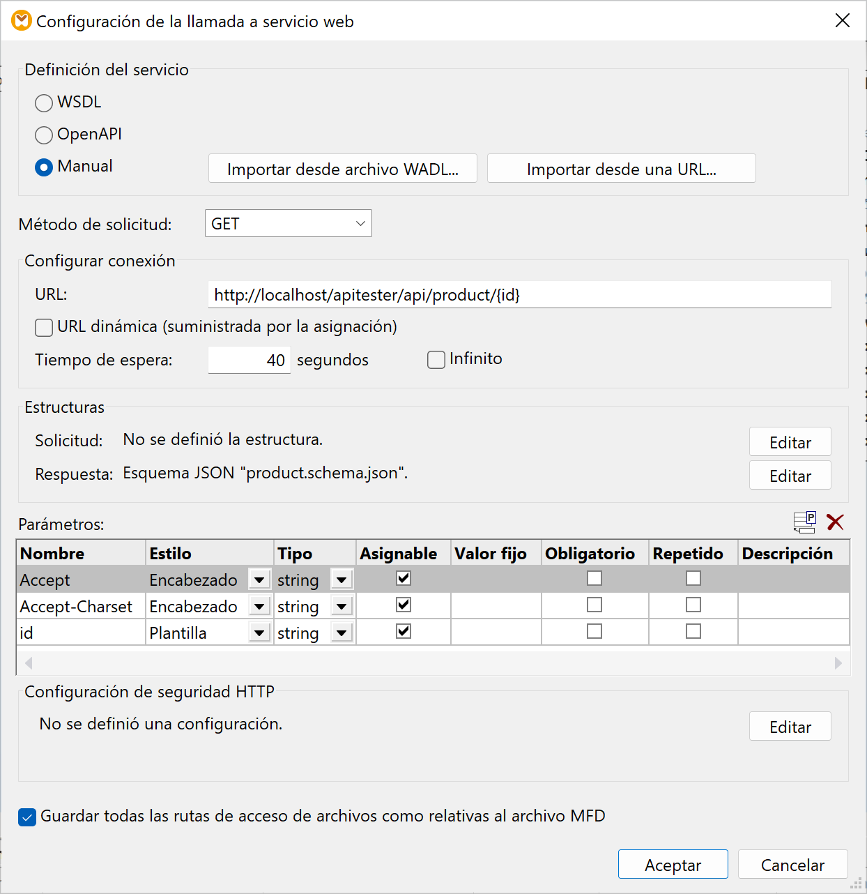 de la barra de herramientas. Como alternativa, vaya al menú Insertar y seleccione Función de servicio web. Esto hace que aparezca el cuadro de diálogo Configuración de la llamada a servicio web (imagen siguiente).