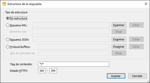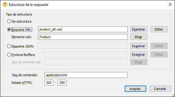 . Al hacer clic en este botón, se abre el cuadro de diálogo Estructura de la respuesta (imágenes siguientes). Ambos cuerpos disponen de estructuras de respuesta en formato XML. Los cuerpos también pueden aceptar contenidos de otros tipos (por ejemplo, JSON).
