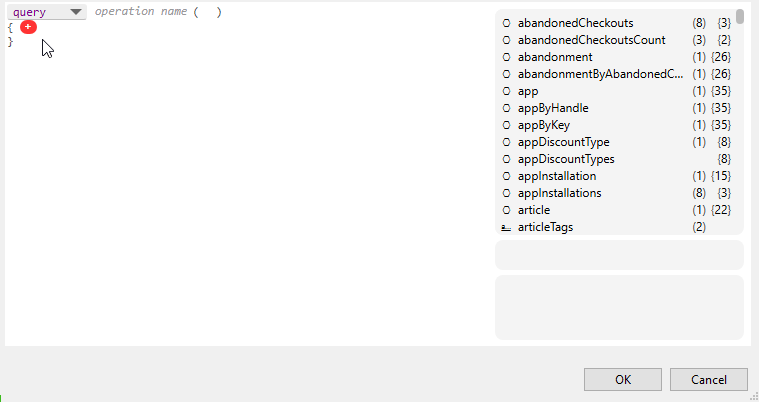 La imagen siguiente muestra el editor de consultas/mutaciones del cuadro de diálogo Configuración GraphQL.