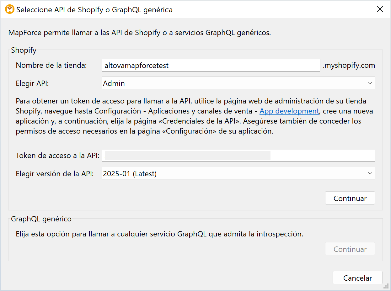 3.Si desea llamar a la API de Shopify, rellene los datos de conexión pertinentes en el cuadro de diálogo y haga clic en Continuar en la sección Shopify. Para obtener más detalles sobre la configuración de Shopify, consulte la API de Shopify más abajo. Si desea llamar a una API de GraphQL genérico, haga clic en Continuar en la sección GraphQL genérico.