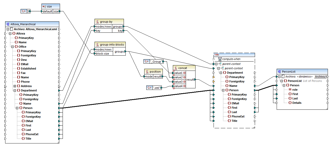 El diseño de asignación que aparece más abajo corresponde al archivo DividePersonsByDepartmentIntoGroups.mfd situado en la carpeta <Documentos>\Altova\MapForce2026\MapForceExamples\.