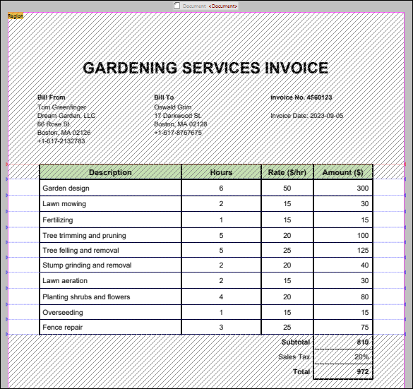 El valor Omitir final (1) ha llevado al algoritmo a excluir las celdas Subtotal, Sales Tax y Total porque el primer borde desde la parte inferior de la región se ha identificado en la línea donde termina la fila Fence repair. El resto de la tabla se dividirá en filas (ver la parte inferior atenuada en color gris en la imagen siguiente).