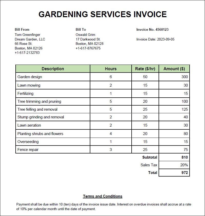 El documento PDF (imagen siguiente) del que queremos extraer los datos es una factura simple que contiene un encabezado, una tabla con la descripción de los servicios prestados de jardinería, información sobre la empresa, el cliente y la factura, así como las condiciones. La factura es un documento creado electrónicamente que contiene una sola página.