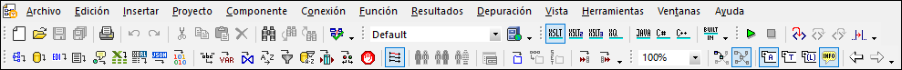 La barra de menú muestra los diferentes menús de la aplicación. Por su parte, las barras de herramientas muestran un grupo de botones que corresponden a comandos de MapForce. Las barras de herramientas se pueden arrastrar a una posición diferente si lo desea. En la imagen siguiente puede ver la barra de menú y las barras de herramientas. La interfaz actual depende de la edición de MapForce que esté usando y de cómo configure la aplicación.