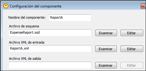Por último, el tercer componente está configurado para generar un archivo de salida llamado ReportC.xml. El valor del campo Archivo XML de entrada no es relevante porque se trata del componente de destino.