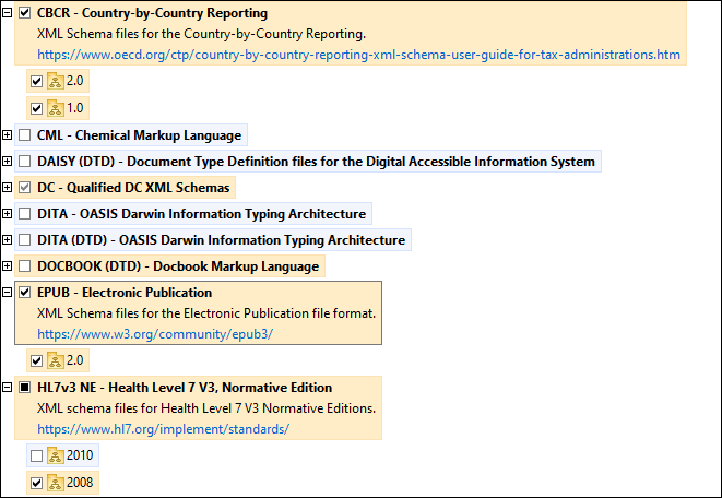 Esquemas instalados: estos aparecen en la IGU con sus casillas marcadas (en la imagen siguiente las versiones marcadas de los esquemas EPUB y HL7v3 NE son las que están instaladas). Si se seleccionan todas las versiones de un esquema, en la casilla del esquema aparece una marca de verificación. Si hay al menos un esquema sin seleccionar, en la en la casilla del esquema aparece un cuadrado negro. Para desinstalar un esquema debe desmarcar la casilla correspondiente (en la imagen siguiente, el DTD DocBook está instalado y su casilla se ha desmarcado, es decir, se va a desinstalar).