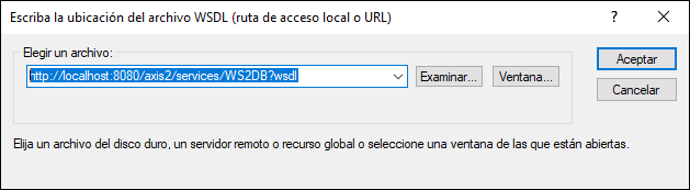 Ejecute XMLSpy Enterprise Edition. En el menú SOAP, haga clic en Crear solicitud SOAP nueva. Cuando la aplicación lo solicite, introduzca el WSDL del servicio web (en este ejemplo, http://localhost:8080/axis2/services/WS2DB?wsdl).