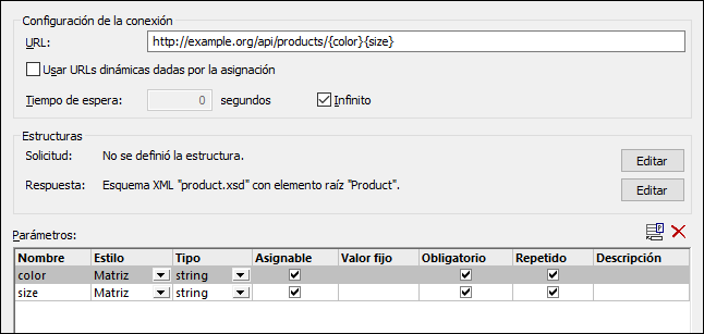 El servicio web de este ejemplo recupera una lista de productos que coinciden con el color y el tamaño dados como argumentos. El estilo de los parámetros es Matriz, es decir, se pueden definir como marcadores de posición tanto dentro de la URL como en la tabla de asignación. Observe que los parámetros están marcados como asignables y que la opción Repetido está marcada. Esto significa que su valor se leerá desde una secuencia de valores de la asignación (por ejemplo, una lista de filas dentro de un archivo de texto, un nodo XML o una columna de base de datos) y se enviará al servicio web en tiempo de ejecución. Por tanto, una dirección URL como esta podrá convertirse en la URL http://example.org/api/products/;color=red;color=blue;size=big;size=small siempre y cuando la asignación aporte los valores red y blue para el color y big y small para el tamaño.