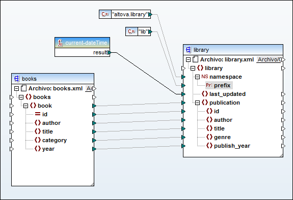 Ahora puede crear asignaciones entre estos nodos y valores de cadena. Por ejemplo, en la imagen siguiente puede ver que se definieron dos constantes que aportan el espacio de nombres altova.library y el prefijo lib (imagen siguiente).
