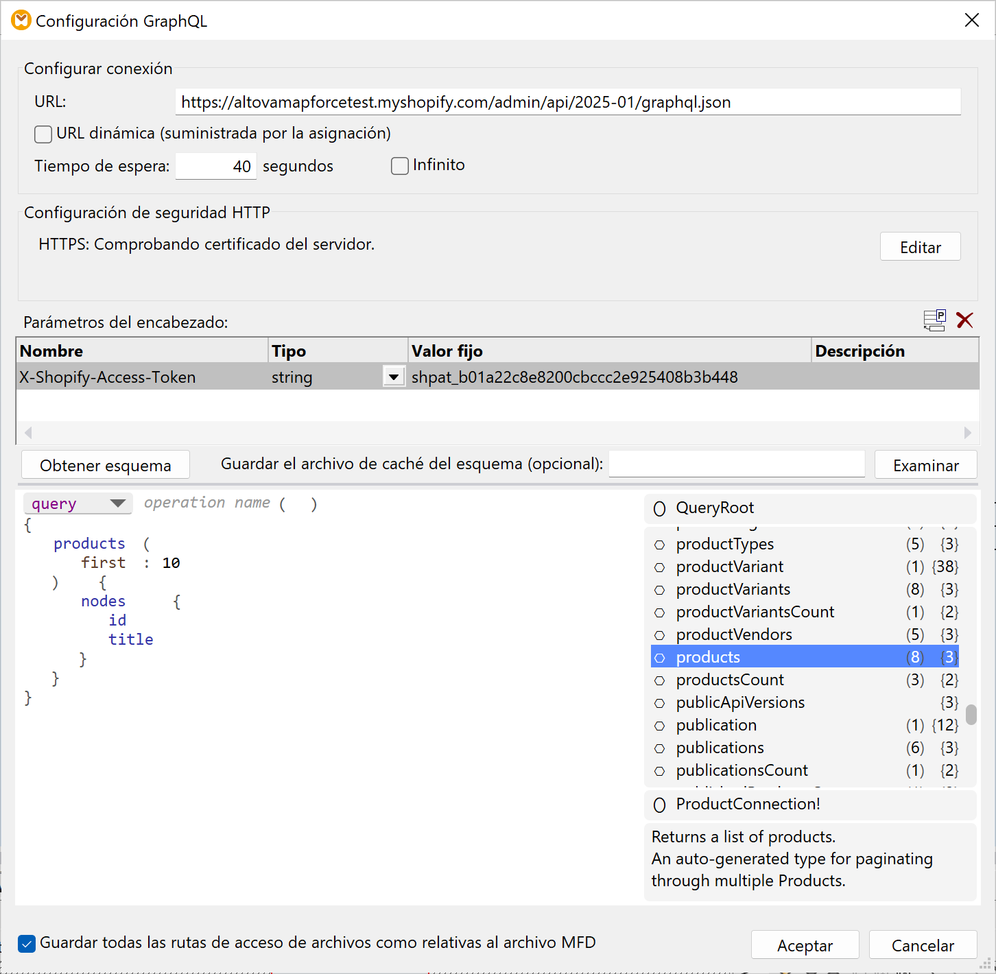 Tras seleccionar la API (la API de Shopify o una API genérica de GraphQL) a la que se debe llamar, tendrá que definir estas opciones en el cuadro de diálogo Configuración GraphQL (imagen siguiente):