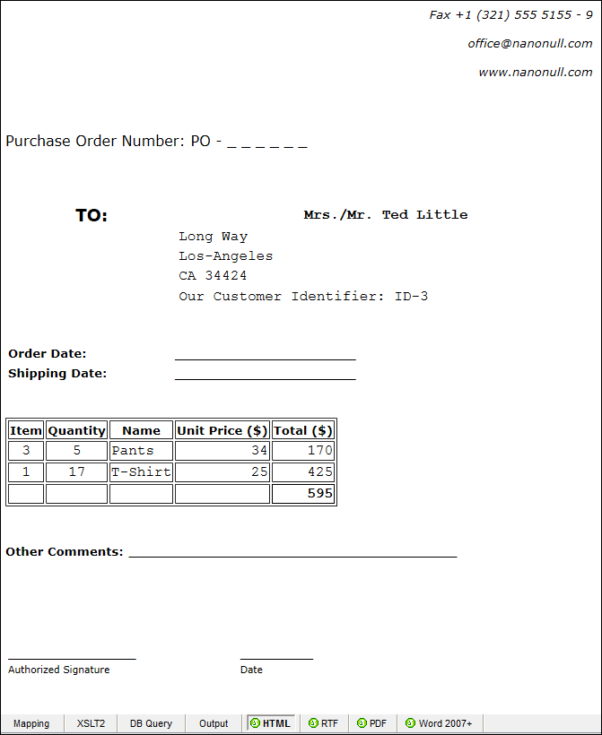En el ejemplo siguiente (MapForceExamples\CompletePO.mfd) puede ver el resultado de la asignación en el panel de resultados HTML de StyleVision. Esta asignación genera un pedido en formato XML. Haga clic con el botón derecho en el componente de destino, seleccione Propiedades y observe que la asignación tiene asignado un archivo .sps.