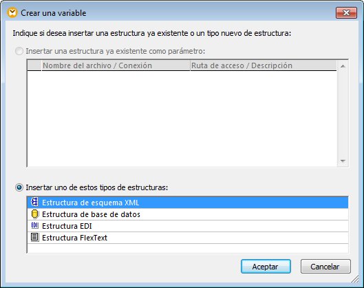 3.Haga clic en Elegir para seleccionar el origen del que se debe tomar la estructura de la variable. Las estructuras que ve en la imagen siguiente se aplican solamente a MapForce Enterprise Edition. Consulte la lista de estructuras relevantes para las otras ediciones de MapForce en el apartado anterior.