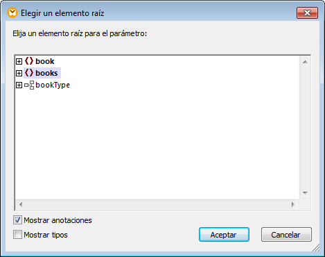 4.Cuando la aplicación se lo pida indique el elemento raíz de la estructura de la variable. Por ejemplo, en los esquemas XML puede seleccionar cualquier elemento o tipo de la fuente seleccionada (imagen siguiente).