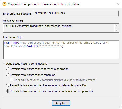 Al ejecutar la asignación con esta configuración aparece el cuadro de diálogo "Excepción de transacción de base de datos". Configure las opciones como en la imagen siguiente y repita su selección tantas veces como se lo pida la aplicación: