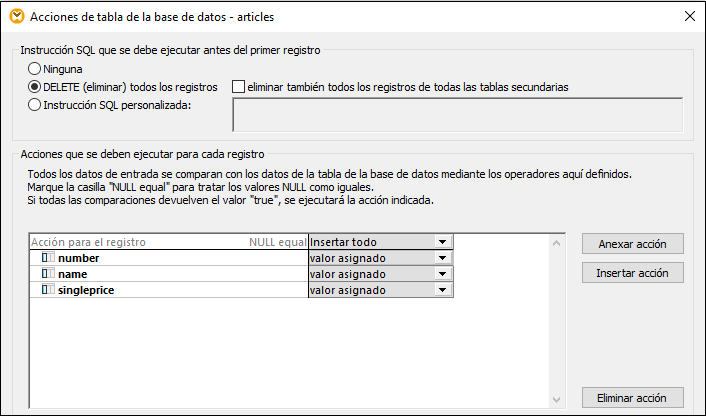 Esto crea la tabla articles en la base de datos en memoria. La tabla articles consiste en tres columnas: number, name y singleprice. Estas columnas sirven para almacenar datos de los elementos con el mismo nombre definidos en el esquema XML de origen. Cada columna tiene designado un tipo de datos compatible con los datos que se van a guardar en esa columna.