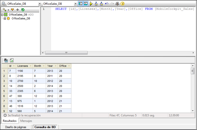 1.Se establece una conexión con la base de datos desde la ventana Consulta de BD | Conectarse a un origen de datos.