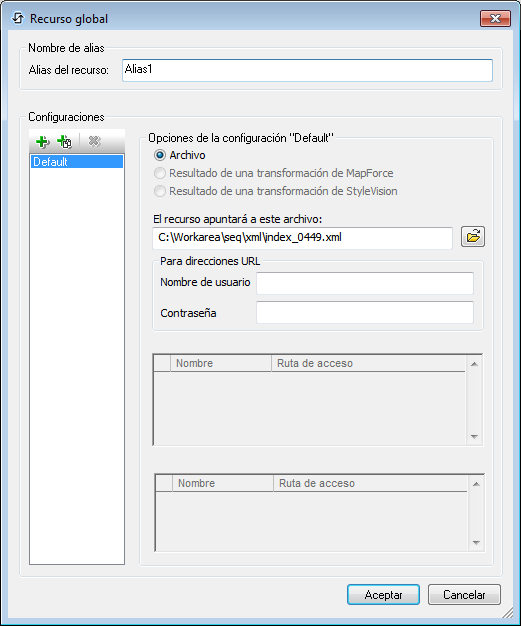 El cuadro de diálogo "Recurso global" para archivos (imagen siguiente) se abre con el comando Agregar | Archivos del cuadro de diálogo Administrar recursos globales. En este cuadro de diálogo puede indicar las configuraciones del alias que aparece en el cuadro de texto Alias del recurso. Después de definir las propiedades de las configuraciones (tal y como se explica más abajo), guarde la definición del alias haciendo clic en Aceptar.