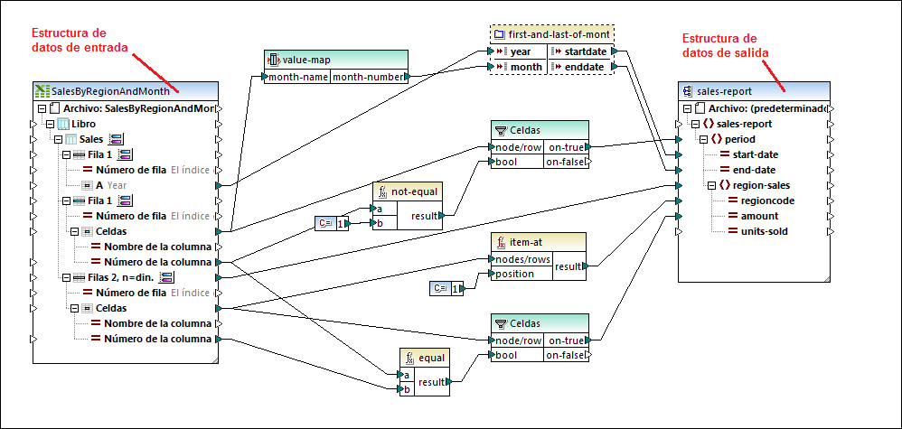 •El nombre de los componentes de entrada y salida que desea usar. En el diseño de la imagen anterior, por ejemplo, los nombres de los componentes son SalesByRegionAndMonth y sales-report. Recuerde que puede especificar varios componentes de entrada y salida. Si en el diseño se necesitan varios componentes de entrada para generar una sola estructura de datos de salida, todos deben darse como parámetros (de entrada y salida) en la acción Transferencia de MapForce.