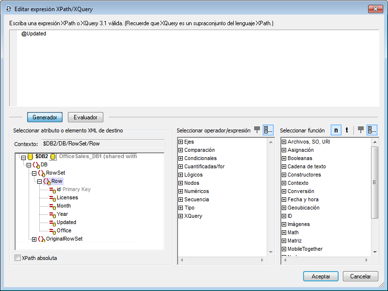 •Si se modificara la expresión XPath para apuntar al nodo @Updated empezando por el nodo raíz (así, por ejemplo: $DB2/DB/RowSet/Row/@Updated), entonces se actualizaría el nodo @Updated de todos los elementos Row.
