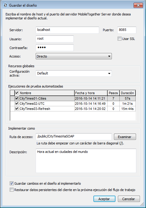 Los casos de prueba se implementan con el diseño en MobileTogether Server con ayuda del comando Archivo | Implementar en MobileTogether Server. Este comando abre el cuadro de diálogo "Guardar el diseño" (imagen anterior), donde deberá indicarse: (i) los datos de acceso del servidor, (ii) la ruta de acceso que debe tener el diseño en el servidor y (iii) los casos de prueba que se deben implementar con el diseño (seleccione qué casos de prueba desea implementar).