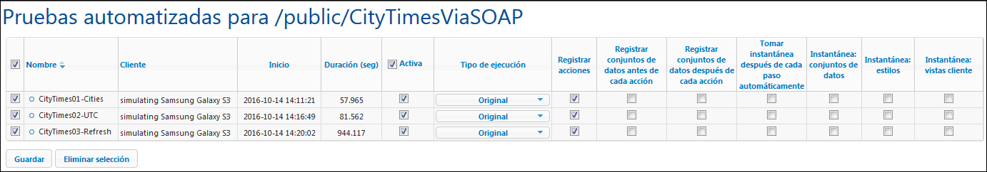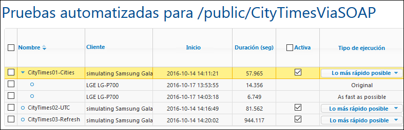 Cuando se termina de reproducir un caso de prueba en el cliente, los resultados se almacenan en el servidor y aparecen en la página Pruebas automatizadas (imagen siguiente). El resultado de cada reproducción aparece como descendiente de su caso de prueba. Por ejemplo, en la imagen siguiente, puede ver que se almacenaron dos ejecuciones de prueba para el caso de prueba CityTimes01-Cities. En la página Pruebas automatizadas puede verse también el dispositivo cliente donde se realizó la ejecución de prueba y la hora a la que se realizó. Para eliminar una ejecución de prueba marque su casilla en la primera columna de la página y haga clic en Eliminar selección.