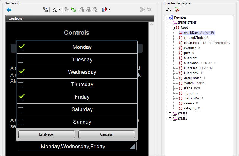 En la imagen siguiente los valores que corresponden a las opciones seleccionadas están concatenados en una sola cadena (separados por comas) e introducidos en el nodo de atributo weekly (resaltado). El separador de la cadena que se introduce en la fuente de página se indica con la propiedad Separador de selección múltiple (imagen siguiente), mientras que el separador de la cadena que se muestra en el cuadro combinado se indica con la propiedad Separador de selección múltiple visible (imagen siguiente).