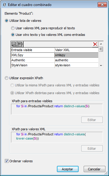 1.Primero seleccione cómo quiere definir las entradas y los valores: (i) con una lista de valores o (ii) con expresiones XPath. 2.Si quiere ordenar los elementos de la lista desplegable, marque la casilla Ordenar valores. 3.Haga clic en Aceptar para terminar.