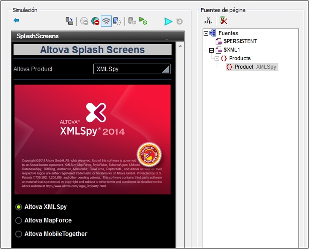 Por ejemplo, en la imagen siguiente, los tres botones de opción están asociados a un nodo XML de la fuente de página: un elemento llamado Product. Esto crea un conjunto de botones de opción que se excluyen mutuamente para el nodo Product. Cada botón de opción recibe un valor a través de la propiedad Valores marcados. El texto del botón es el valor de la propiedad Texto del botón.