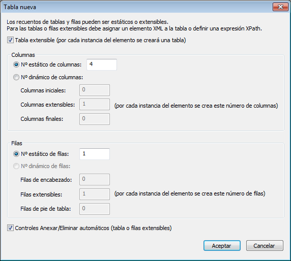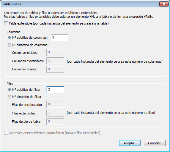 •En una tabla con filas dinámicas lo que se repite no es la tabla entera sino un grupo de filas de la tabla. Para crear este tipo de tabla asegúrese de que la casilla Tabla extensible no está marcada y después seleccione el botón de opción Nº dinámico de filas. Cada instancia del elemento que se repite crea un número de filas especificado por el usuario. El número de columnas puede ser fijo (estático) o extensible (dinámico).