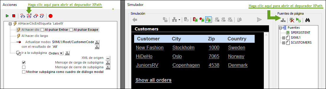 1.Al editar una expresión XPath en el diseño. Por ejemplo, al introducir expresiones para definir valores de estilos y propiedades puede depurar expresiones probándolas con un archivo XML que se carga en el Depurador.