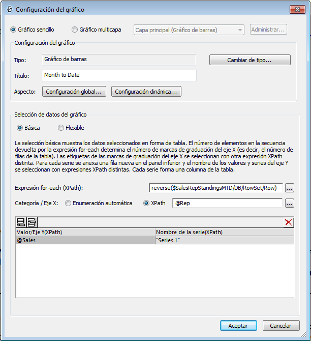 Los gráficos se configuran en el cuadro de diálogo "Configuración del gráfico" (imagen siguiente). La configuración de un gráfico conlleva dos fases distintas: (i) en la primera se especifica la selección de datos para los ejes del gráfico y (ii) en la segunda se definen las propiedades del gráfico. Las opciones de configuración se definen cuando se crea el gráfico pero pueden modificarse en cualquier momento. Tras asignar el nodo XML de contexto al gráfico abra el cuadro de diálogo "Configuración del gráfico" para definir su configuración. El cuadro de diálogo se puede abrir de dos maneras: