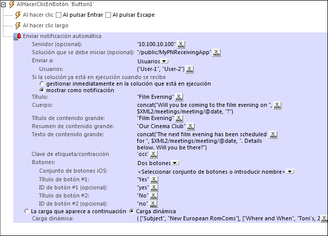 •Una NA puede contener botones de NA. Se puede definir el texto y el identificador de hasta tres botones de NA. Cuando un usuario pulsa un botón, el ID del botón se pasa a un nodo de fuente de página de la solución. Este identificador permite determinar cómo desea reaccionar el usuario a la NA, así como definir las acciones correspondientes (en la pestaña del evento AlRecibirNotificaciónAutomática). Recuerde que los botones de NA que aparecen en pantalla en dispositivos iOS se habilitan para aplicaciones de la AppStore y no para soluciones de MobileTogether estándar.