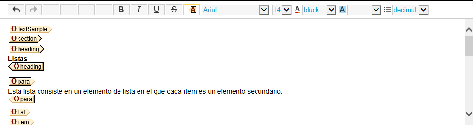 •Los iconos para aplicar los formatos negrita (Ctrl+B), cursiva (Ctrl+I), subrayado (Ctrl+U) y tachado al texto seleccionado. A nivel de marcadores, estos estilos respectivos se aplican envolviendo el texto seleccionado con el elemento asignado al icono en cuestión. (El estilo correspondiente viene especificado por el elemento o por un atributo designado, véase Asignaciones de la barra de herramientas.)