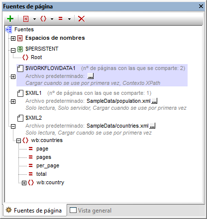 El panel Fuentes de página (imagen siguiente; véase Interfaz del usuario) sirve para gestionar y administrar las fuentes de página de las páginas. Estas fuentes de página aportan (i) tanto la estructura jerárquica de los datos utilizados en el diseño (ii) como los datos que se almacenan en las estructuras jerárquicas.
