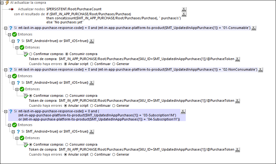 En la imagen anterior puede ver las acciones AlActualizarCompra definidas en el proyecto de ejemplo. La confirmación depende del tipo de producto porque (i) los artículos consumibles y (ii) las suscripciones y los artículos no consumibles necesitan tipos distintos de confirmación.