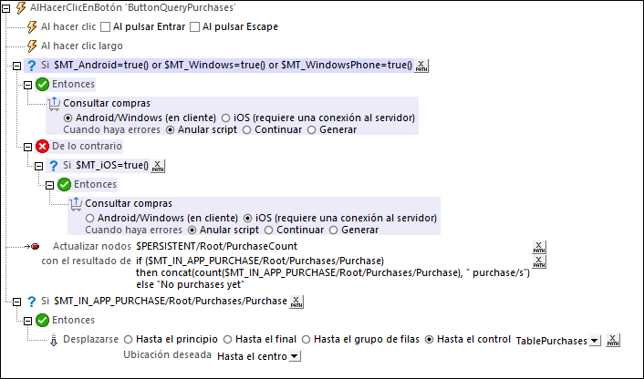 Los botones Consultar compras y Restaurar compras (iOS) obtienen de la tienda de aplicaciones información sobre las compras del usuario actual. Los botones ejecutan, respectivamente, las acciones Consultar compras y Restaurar compras. La diferencia entre estas dos acciones es que Restaurar compras, además de obtener la información de las compras realizadas desde la aplicación en el dispositivo actual, también restaura las compras realizadas por el usuario actual en otros dispositivos. Se trata de un requisito de la tienda de aplicaciones de iOS, por lo que conlleva crear una acción aparte con este fin.