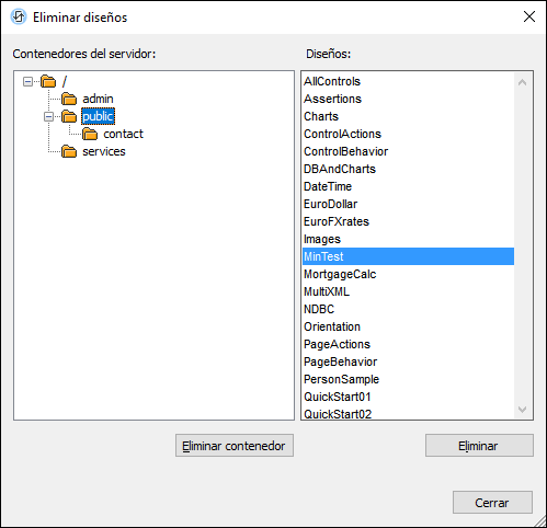 Al hacer clic en Continuar aparece una ventana con las carpetas de MobileTogether Server (contenedores) y las soluciones (diseños) que contienen (imagen siguiente). Navegue hasta el contenedor o el diseño que quiere eliminar, selecciónelo y haga clic en Eliminar contenedor o Eliminar. |