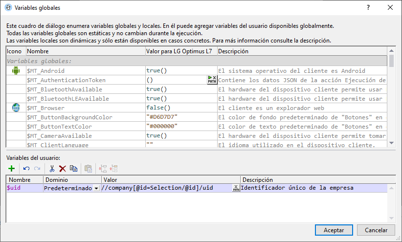 •Variables de valor estático (denominadas Variables globales en el cuadro de diálogo): contienen información sobre el dispositivo móvil. El valor de estas variables no cambia durante la ejecución del proyecto. Observe que en la columna Valor del panel superior se especifica el dispositivo móvil que está seleccionado en cada momento. Los valores que aparecen son para dicho dispositivo. Para las simulaciones se considera que el dispositivo cliente es el que está seleccionado en el cuadro combinado Selector de dispositivo. Por ejemplo, la variable $MT_Android tiene el valor true cuando el dispositivo que se está usando es Android. (La información del dispositivo la envía el dispositivo durante el procedimiento de comunicación móvil estándar.)