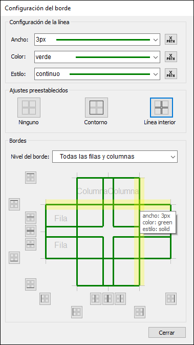 •Línea interior: esta opción solo se habilita cuando se seleccionan al menos dos celdas/filas/columnas adyacentes; no es aplicable a las tablas. Por ejemplo: (i) si se aplica a dos columnas, entonces el estilo actual se aplica únicamente a los bordes verticales interiores de todas las celdas de la columna; (ii) si se aplica a dos celdas adyacentes horizontalmente, entonces el estilo se aplica a los bordes verticales interiores de ambas celdas; (iii) si se aplica a dos celdas adyacentes verticalmente, entonces el estilo se aplica a los bordes horizontales interiores de ambas celdas.