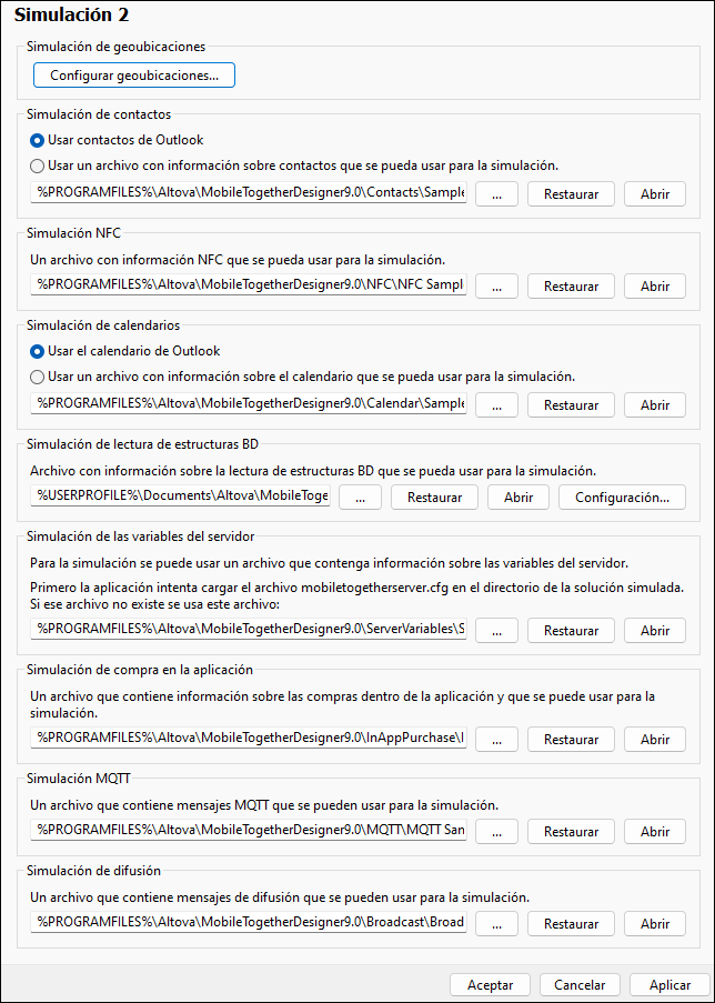 Puede especificar si quiere usar su calendario de Microsoft Outlook* para simular la aplicación de calendario del dispositivo. Si Outlook no está disponible, se puede usar un archivo XML para proporcionar datos para la simulación de calendario.
