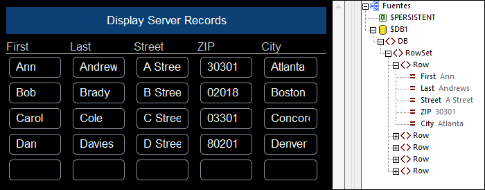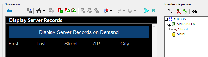 Observe en las capturas de pantalla de los diseños que las celdas de tabla de 02-DisplayRecords.mtd (2) están vinculadas a la fuente de página $DB1 (imagen siguiente izquierda), mientras que las celdas de la tabla de 03-DisplayOnDemand.mtd (3) están vinculadas a la fuente de página $PERSISTENT (imagen siguiente derecha). Estas fuentes de página, $DB1 (la fuente de página vinculada a la BD del servidor) y $PERSISTENT (la fuente de página del cliente), son las responsables de que los datos de las respectivas fuentes de página aparezcan en la tabla.